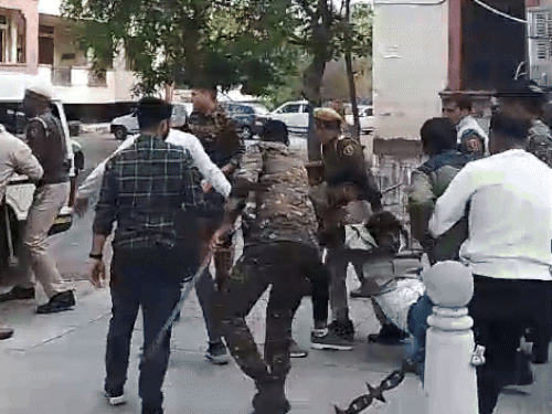 पुलिस फोर्स ने छात्रों को बलपूर्वक धरनास्थल से घसीटते और टांगाटोली करके जीप में डालकर गांधी नगर थाने ले गए।