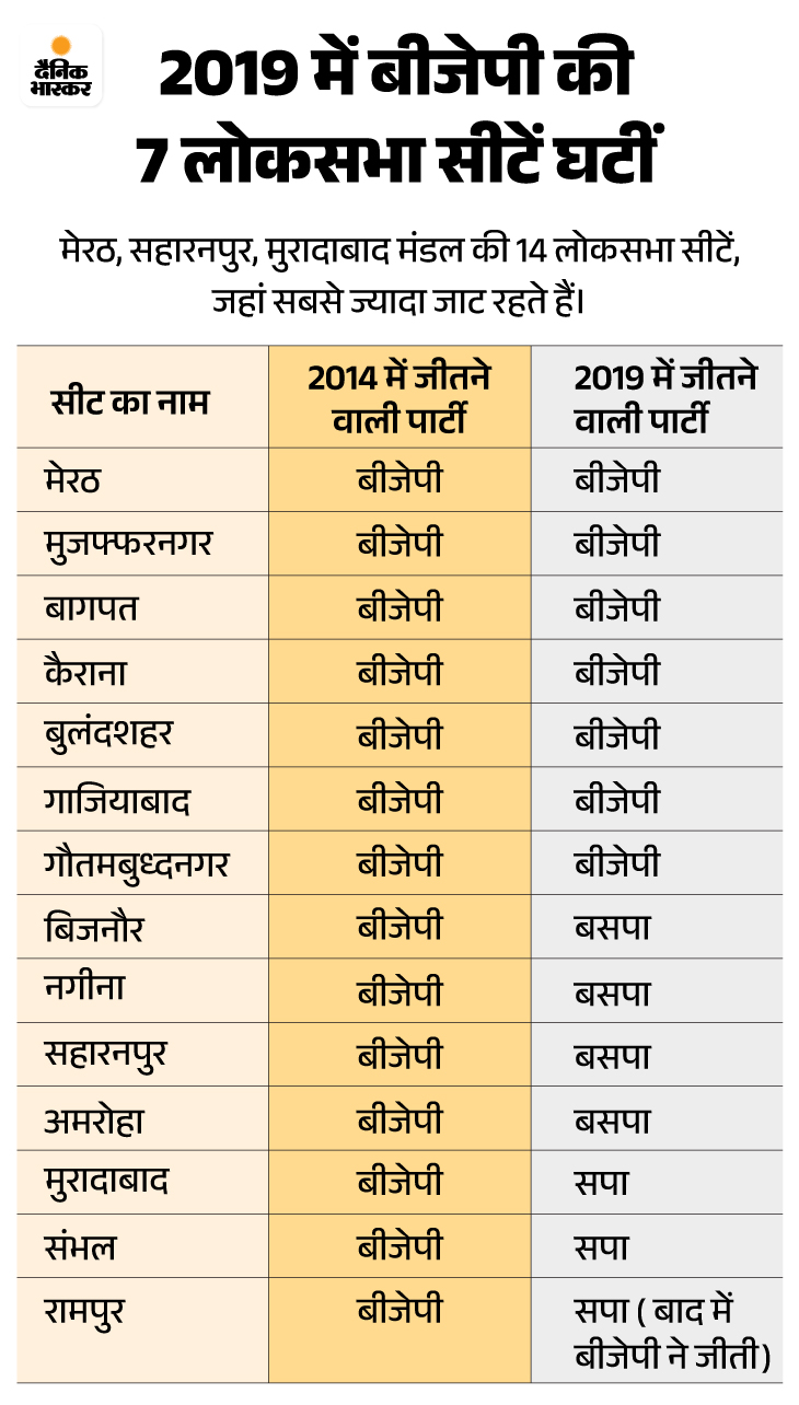 दरअसल, 2019 के लोकसभा चुनाव में भाजपा को यूपी में जिन 16 सीटों पर हार मिली थी, उनमें से 7 सीटें वेस्ट यूपी की थीं। इसके पीछे कारण यह था कि अब तक वेस्ट यूपी में जाट वोट भाजपा और रालोद के बीच बंट जाता था। हालांकि, मुजफ्फरनगर दंगों के बाद से जाट वोटों का बड़ा हिस्सा भाजपा के खाते में चला गया था।