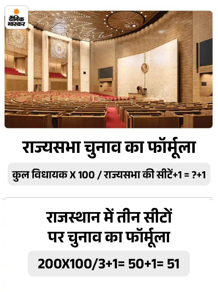 राज्यसभा के सदस्यों को विधायक चुनते हैं। चुनाव के फॉर्मूले के तहत विधायकों की कुल संख्या में राज्यसभा की रिक्त सीटों में 1 जोड़कर भाग दिया जाता है। जैसे, राजस्थान में 200 विधायक हैं और राज्यसभा की 3 सीटें खाली हैं। ऐसे में 200 में 3+1(= 4) का भाग देने पर संख्या 50 आती है, जिसमें एक जोड़ने पर यह 51 हो जाता है।