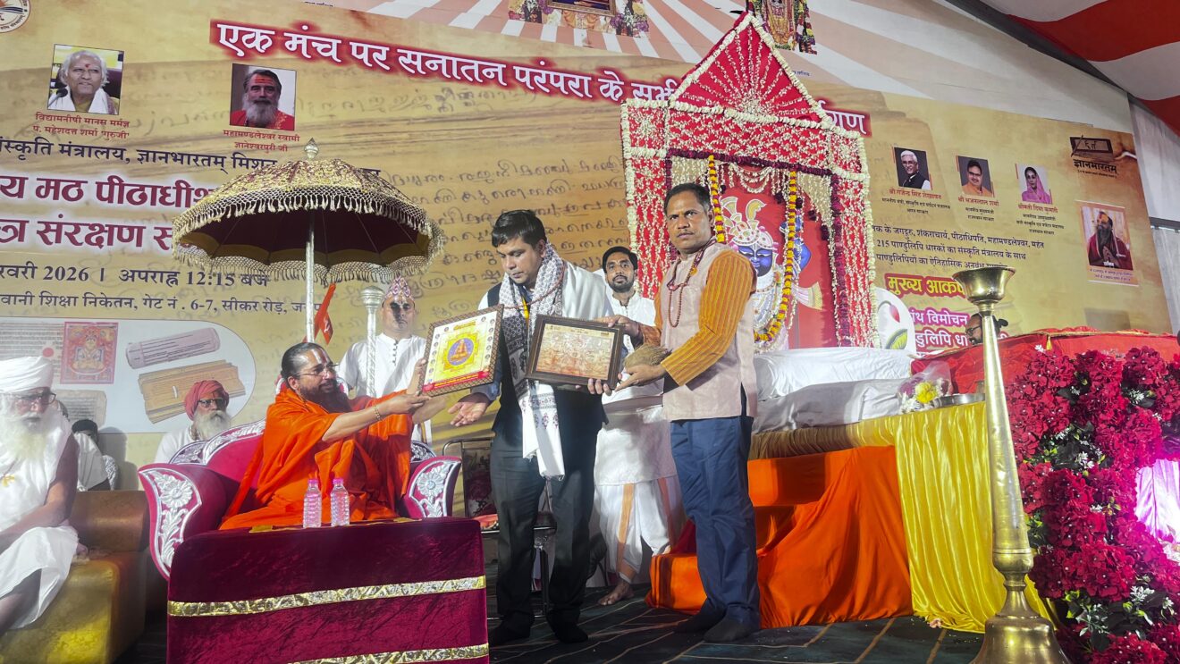 बीकानेर। मरुधरा की सांस्कृतिक राजधानी बीकानेर के लिए आज अत्यंत गौरव का क्षण रहा, जब जयपुर में आयोजित श्रीमद्जगद्गुरु श्री रामानंदाचार्य जी के 825वें प्राकट्योत्सव के उपलक्ष्य में हो रहे 108 कुंडीय श्री राम महायज्ञ एवं ज्ञान भारतम् मिशन संस्कृति मंत्रालय भारत सरकार व मंदिर श्री रघुनाथ ट्रस्ट के संयुक्त तत्वावधान में महंत श्री हरि शंकर दास जी महाराज वेदांती जी के द्वारा अखिल भारतीय मठ-पीठाधीश्वर समागम के भव्य समारोह में बीकानेर के प्रतिष्ठित अभय जैन ग्रन्थालय के निदेशक ऋषभ नाहटा का संत समाज द्वारा सम्मान किया गया।उन्हें दुर्लभ जैन, वैदिक एवं संत साहित्य की पांडुलिपियों के संरक्षण, सुव्यवस्थित संकलन तथा डिजिटाइजेशन के क्षेत्र में उल्लेखनीय योगदान के लिए सम्मानित किया गया।