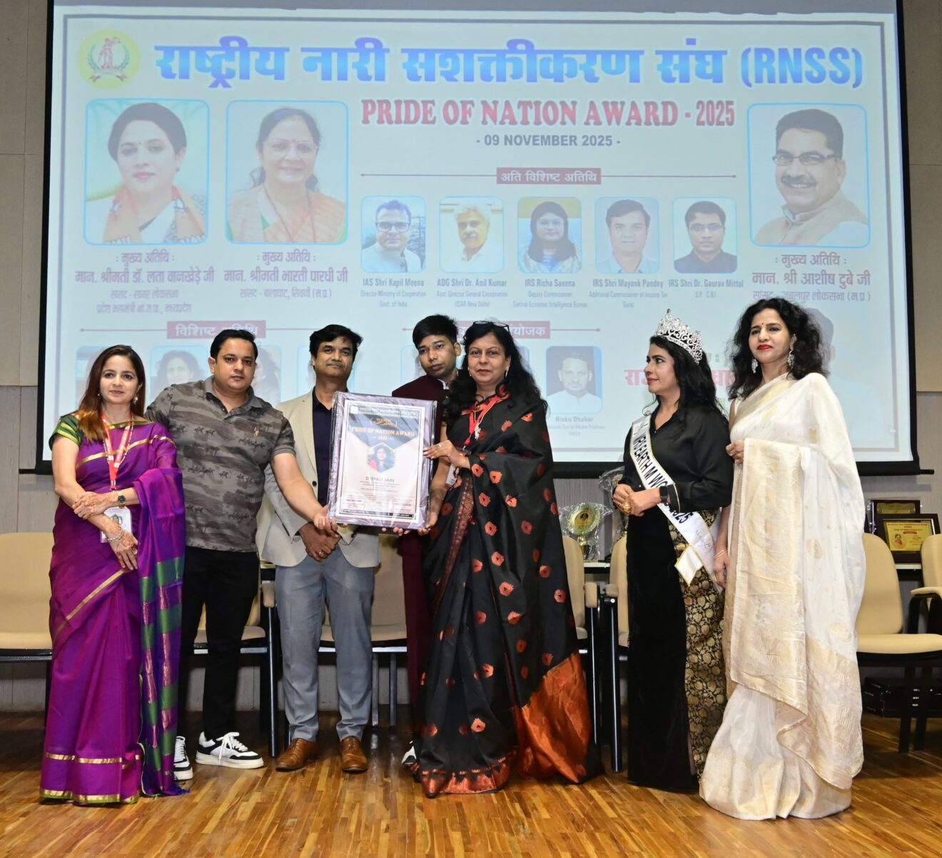 दिल्ली के मानस भवन में राष्ट्रीय नारी सशक्तीकरण संघ द्वारा आयोजित प्राइड ऑफ नेशन अवॉर्ड 2025 में मेरठ की समाजसेविका और अनुराग्यम की राष्ट्रीय संयोजक दीपाली जैन को समाज सेवा में उनके उत्कृष्ट योगदान के लिए सम्मानित किया गया। यह सम्मान उन्हें सांसद डॉ. लता वानखेड़े, राष्ट्रीय अध्यक्ष राजकुमार धाकड़ और राष्ट्रीय सोशल मीडिया प्रभारी रिंकू धाकड़ ने प्रदान किया।