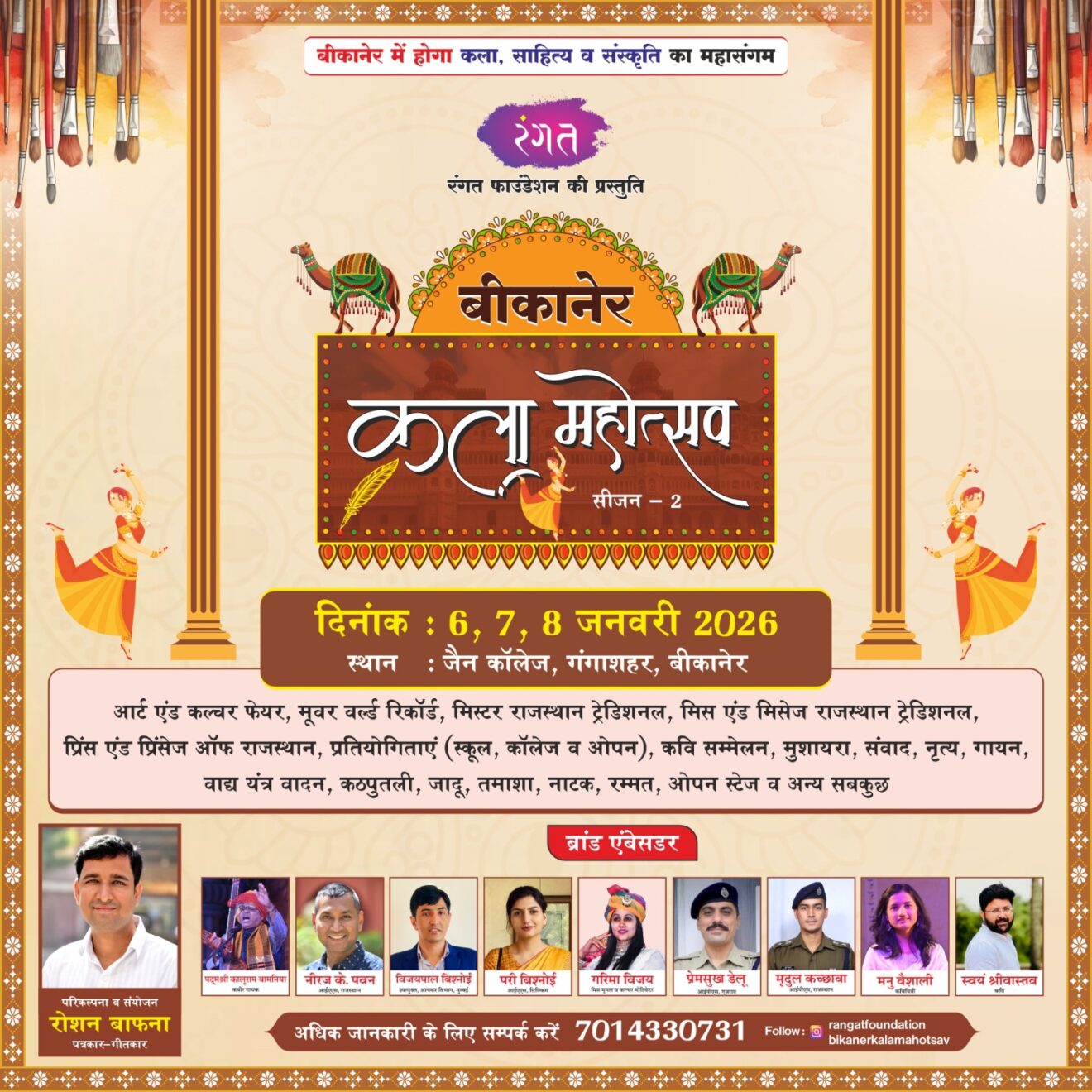 बीकानेर/राजस्थान।राजस्थान के कला, साहित्य व संस्कृति प्रेमियों के लिए एक बार फिर बीकानेर कला महोत्सव का आयोजन होने जा रहा है। आगामी 6, 7 व 8 जनवरी को बीकानेर कला महोत्सव का सीजन-2 आयोजित होगा। गंगाशहर, बीकानेर के जैन कॉलेज ग्राउंड में आयोजित होने वाले इस महोत्सव के दौरान लगातार तीन दिन सुबह 9 बजे से रात 10 बजे तक कला, साहित्य व संस्कृति के विविध रूप-रंग देखने को मिलेंगे। महोत्सव की परिकल्पना करने वाले संयोजक रोशन बाफना ने बताया कि इन तीन दिनों में राज्य स्तरीय आर्ट एंड कल्चर फेयर सहित स्थानीय व राज्य स्तर की प्रतियोगिताएं तथा स्थानीय व राज्य स्तर के करीब 50 से अधिक कार्यक्रम आयोजित होंगे। रोशन बाफना के अनुसार इस महोत्सव में आर्ट एंड कल्चर फेयर, मिस्टर राजस्थान ट्रेडिशनल 2026, मिस एंड मिसेज राजस्थान ट्रेडिशनल 2026, प्रिंस एंड प्रिंसेज ऑफ राजस्थान 2026, मेगा रील स्टार ऑफ राजस्थान, राष्ट्रीय कवि सम्मेलन, स्थानीय कवि सम्मेलन व मुशायरा, राजस्थानी भाषा विशेष कार्यक्रम, भरतनाट्यम, कत्थक, घूमर, चरी नृत्य, लोक नृत्य, मांड गायन, लोक गायन, कबीर वाणी, वाद्ययंत्र वादन, कठपुतली, तमाशा, बहरूपिया, जादू, नाटक, रम्मत, रासलीला, गणगौर, ओपन स्टेज, मूवर वर्ल्ड रिकाॅर्ड, फड़, कावड़, मांडणा, मथेरण, खादी-चरखा, हस्त शिल्प, पुस्तक विमोचन व चर्चा, युवा संवाद सहित स्कूल-काॅलेज व ओपन केटेगरी में लोकनृत्य, लोकगायन, शास्त्रीय संगीत, स्केचिंग, पेटिंग, हैंडीक्राफ्ट, फोटोग्राफी, रील कॉन्टेस्ट, मेंहदी, साफा, पगड़ी, नेल आर्ट, हेयर स्टाइल, मिमिक्री, एक्टिंग, डेकोरेशन आर्ट व झांकी सहित विभिन्न कार्यक्रम व प्रतियोगिताएं आयोजित होंगी। आईएएस नीरज के. पवन, आईएएस परी विश्नोई, आईपीएस प्रेमसुख डेलू, आईपीएस मृदुल कच्छावा, आईआरएस विजयपाल विश्नोई, कल्चर मोटिवेटर व कल्चर आइकन मिस मूमल गरिमा विजय, कवियित्री मनु वैशाली, कवि स्वयं श्रीवास्तव व पद्मश्री कबीर गायक कालूराम बामनिया बीकानेर कला महोत्सव के ब्रांड एंबेसडर हैं। कार्यक्रम में कवि वरुण आनंद, स्वयं श्रीवास्तव, मनु वैशाली, पद्मश्री कबीर गायक कालूराम बामनिया, कल्चर मोटिवेटर मिस मूमल गरिमा विजय सहित देश-प्रदेश विभिन्न कलाकार व कवि प्रस्तुति देंगे।