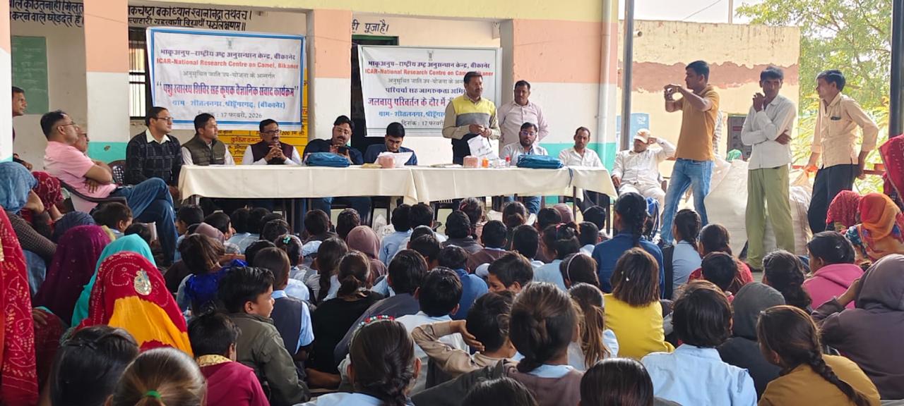 बीकानेर, 17 फरवरी 2026 । भाकृअनुप-राष्ट्रीय उष्ट्र अनुसंधान केंद्र (एनआरसीसी), बीकानेर द्वारा आज श्रीडूंगरगढ़ (बीकानेर) के ग्राम शीतलनगर, में ‘अनुसूचित जाति उप-योजना’ (एस.सी.एस.पी.) के तहत एक दिवसीय पशु स्वास्थ्य शिविर एवं कृषक-वैज्ञानिक संवाद कार्यक्रम, राजकीय उच्च प्राथमिक विद्यालय, शीतलनगर में आयोजित किया गया। शिविर में 96 से अधिक महिला व पुरुष पशुपालकों को लाभान्वित किया गया। साथ ही 72 स्कूली विद्यार्थियों में उष्ट्र प्रजाति के प्रति जागरूकता बढ़ाने हेतु ‘जलवायु परिवर्तन के दौर में ऊँट की भूमिका’ विषयक परिचर्चा भी आयोजित की गई।