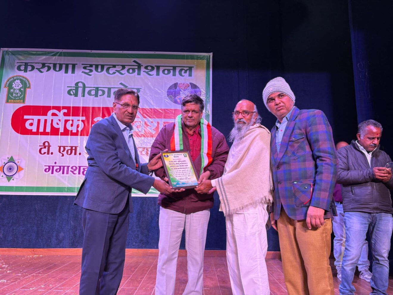 राष्ट्रीय उपाध्यक्ष जतनलाल दूगड़, बीकानेर केंद्र के अध्यक्ष मेघराज बोथरा, सचिव राजेश रंगा एवं शिक्षा अधिकारी घनश्याम साध का करुणा इण्टरनेशनल, चैन्नई के उपाध्यक्ष पदमचंद छाजेड़, संस्था के उतर भारत के शिक्षा अधिकारी भूपेश चारण, जोधपुर केंद्र के उपाध्यक्ष सौरभ वर्मा एवं मंत्री राजेश कुमार ने ओपरना एवं स्मृति चिन्ह प्रदान कर अभिनंदन किया।