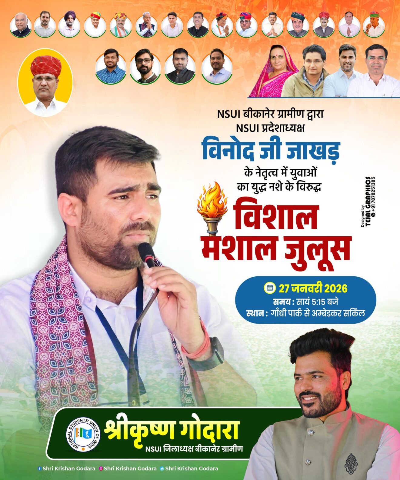 NSUI बीकानेर ग्रामीण द्वारा प्रदेशाध्यक्ष विनोद जाखड़ के नेतृत्व में #युवाओंकायुद्धनशेके_विरुद्ध अभियान के तहत एक विशाल मशाल जुलूस का आयोजन किया जा रहा है। यह जुलूस युवाओं में बढ़ते नशे के प्रभाव के खिलाफ जन-जागरूकता फैलाने एवं इस सामाजिक बुराई के विरुद्ध एकजुट होकर आवाज बुलंद करने के उद्देश्य से निकाला जाएगा।
