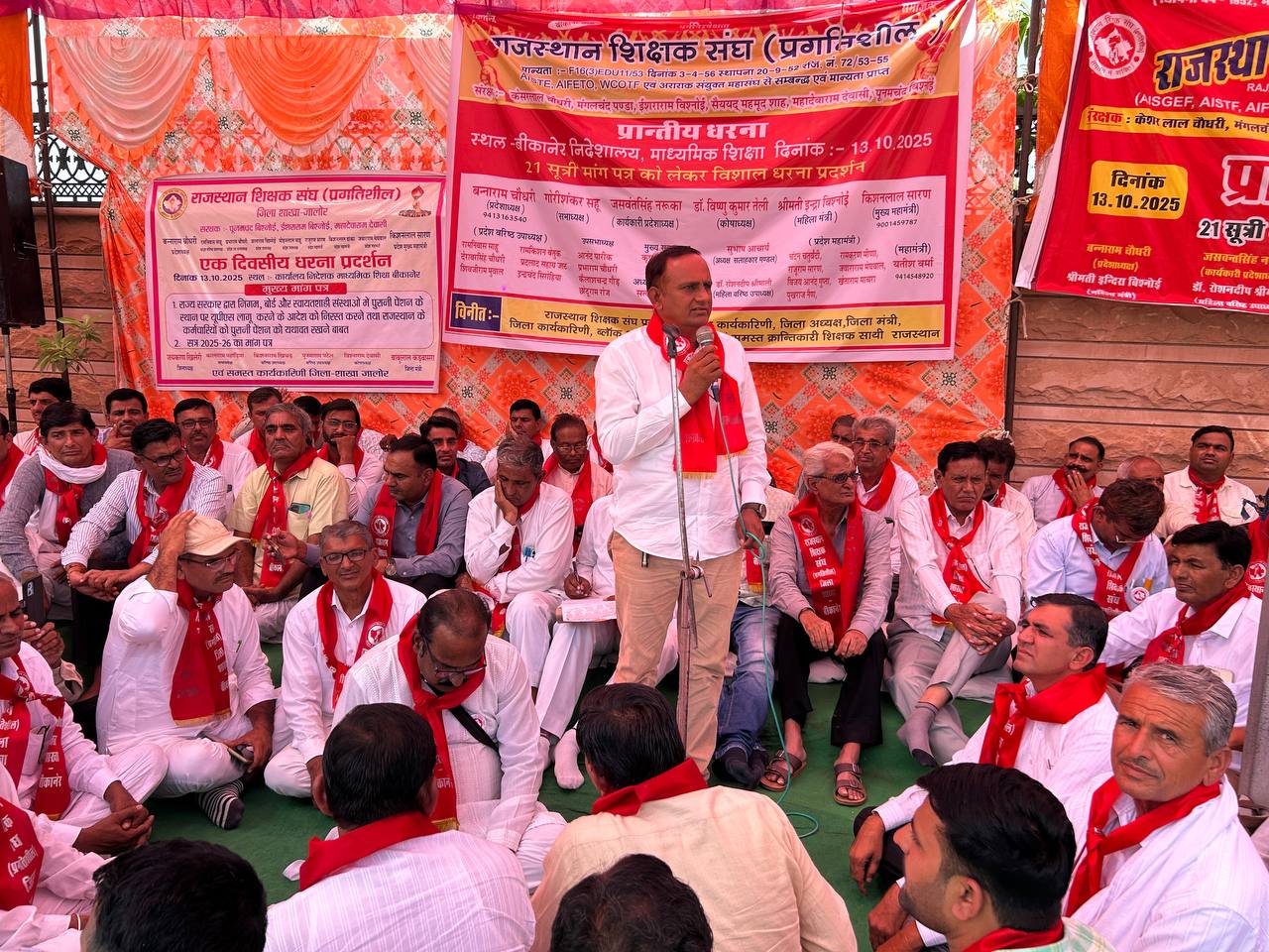 बीकानेर।राजस्थान शिक्षक संघ प्रगतिशील द्वारा शिक्षकों की विभिन्न लंबित समस्याओं के निराकरण को लेकर निदेशक माध्यमिक शिक्षा कार्यालय के समक्ष विशाल धरना एवं प्रदर्शन कर निदेशक माध्यमिक शिक्षा के माध्यम से ज्ञापन राज्य सरकार को भेजा गया। संगठन के महामंत्री यतीश वर्मा के अनुसार प्रदेश स्तरीय धरने एवं प्रदर्शन में सभा का आयोजन प्रदेश अध्यक्ष बनाम चौधरी की अध्यक्षता में आयोजित हुआ। इस अवसर पर प्रदेसाध्यक्ष ने अपने उद्बोधन में राज्य सरकार एवं शिक्षा विभाग से आग्रह किया कि संगठन के 21 सूत्री मांग पत्र में वर्णित समस्याओं के निराकरण के लिए वार्ता आयोजित कर वाजिब मांग की समस्याओं का समाधान किया जावे। मुख्य महामंत्री किशन लाल सारण ने सरकार को चेतावनी दी की समय रहते शिक्षकों की समस्याओं का समाधान नहीं हुआ संघर्ष में सभी को शामिल किया जाएगा। बीकानेर जिलाध्यक्ष आनंद पारीक ने शिक्षकों को वेतन विसंगति , उसे निस्तारण की मांग की । 21 सूत्री मांग पत्र एवं अन्य मांगों को विवरण सभा में प्रस्तुत किया गया सभा को संबोधित करते हुए सरंक्षक पूनम चंद बिश्नोई ने अपने उद्बोधन में न्यायालय के आदेश के अनुसार पाते वेतन में पदोन्नति शिक्षकों को वरिष्ठता लाभ देने एवं राज्य सरकार द्वारा अपेक्षित को लेकर आज से जारी किया जावे। सभा को प्रदेश कार्यकारी अध्यक्ष जसवंत सिंह नरूका ने संगठन के विशाल धरने को संबोधित करते हुए धन्यवाद ज्ञापित किया। सभा को संबोधित करते हुए प्रदेश वरिष्ठ उपाध्यक्ष आनंद पारीक ने निदेशालय स्तर की समस्याओं का अति शीघ्र समाधान करने का आह्वान किया । सभा को बाड़मेर के जिला अध्यक्ष चित्राराम सियाग ने अपने संबोधन में तृतीय श्रेणी शिक्षकों की बकाया पदोन्नति अति शीघ्र करने एवं आगामी दिनों में संघर्ष जारी रखने का आह्वान किया ।सभा को जालौर के जिला अध्यक्ष जय करण बिश्नोई ने भी राज्य सरकार द्वारा पुरानी पेंशन योजना बहाल करने की मांग की। राजस्थान के शिक्षा OPS को यथावत रखने की अपील की गई । सभा के पश्चात जोरदार नारेबाजी करते हुए प्रदर्शन कर 21 सूत्री मांग पत्र का ज्ञापन अतिरिक्त निदेशक प्रारंभिक शिक्षा एवं निदेशालय के स्टाफ ऑफिसर माध्यमिक शिक्षा अशोक शर्मा को दिया गया धरने को बीकानेर के वरिष्ठ प्रदेश मंत्री गुलाब नाथ योगी,असलम मोहम्मद समेजा,जयपुर जिलाध्यक्ष रामचंद्र जाट,बालोतरा जिलाध्यक्ष ठाकराराम,अजमेर जिलाध्यक्ष रामधन जात,टोंक से धन सिंह,हनुमानगढ़ से तरुण मेघवाल ,देवाराम चौधरी बाड़मेर,,के आर सियाग प्रदेशाध्यक्ष NMOPS,कर्मचारी संयुक्त महासंघ बीकानेर अध्यक्ष पृथ्वीराज लेगा,कार्यकारी प्रदेशाध्यक् जसवंत सिंह नरूका,संरक्षक पूनमचंद बिश्नोई ने संबोधित किया। सैकड़ों की संख्य