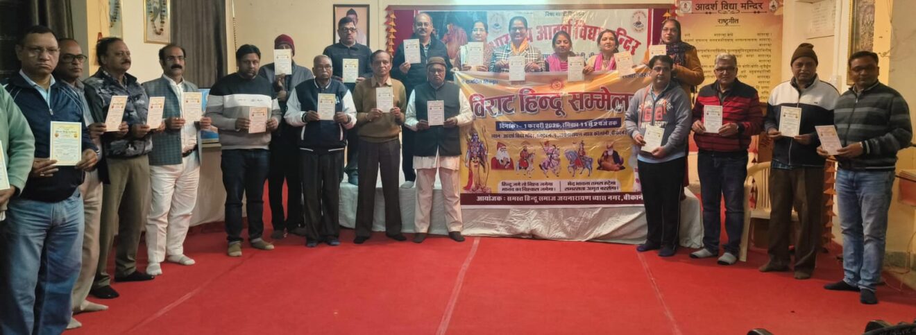 बीकानेर ।आदर्श विधा मंदिर जय नारायण व्यास कॉलोनी में 1 फरवरी को होने वाले हिंदू सम्मेलन के बैनर व निमंत्रण पत्र का विमोचन किया गया ।