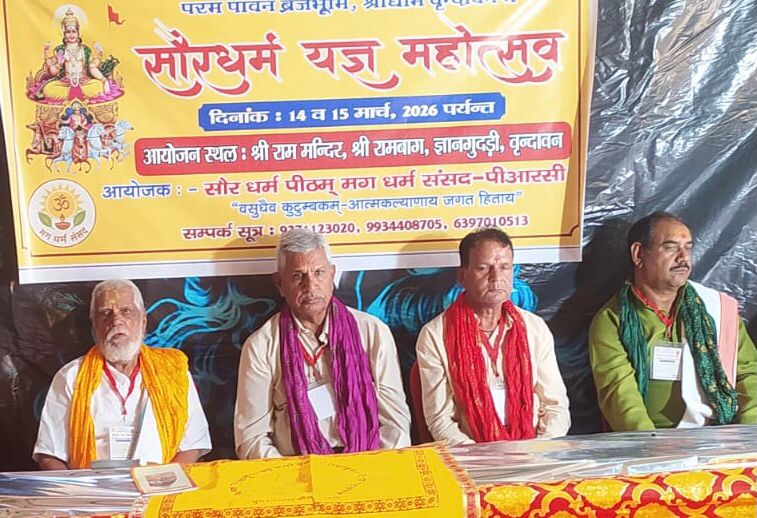 बीकानेर।पावनधाम वृंदावन में दो दिवसीय मग धर्म संसद पीआरसी द्वारा सौर धर्म यज्ञ महोत्सव शैलेश पाठक के संयोजन में सौर धर्म प्रेमीजनों के सहयोग व साथ से संपन्न हुआ । प्रथम दिवस पर श्रीरामबाग राम मंदिर परिसर में दीपोत्सव का आयोजन किया गया तथा शाम को पंडित गोपाल मिश्र द्वारा भजनों की प्रस्तुतियां दी गई । दूसरे दिन श्री श्री १०८ श्री रघुवंश भूषण आचार्य के निदेशन में प्रकांड पंडितों के साथ गुरूकुल के संस्कृत पाठियों के मंत्रोच्चार के बीच सौर धर्म यज्ञ किया, जिसमें समाज कल्याण व विश्व कल्याणार्थ आहूतियां दी गई । इस अवसर पर वैचारिक समागम का आयोजन किया गया जिसके मुख्य अतिथि श्री श्री १०८ श्री रघुवंश भूषण आचार्य थे । बीकानेर के आर के शर्मा, आजमगढ़ के राजेश मिश्र, मुंबई के प्रभु प्रकाश शर्मा, पंडित लक्ष्मी कांत कौशिक, कामिनी भोजक व बिहारी लाल वशिष्ठ विशिष्ट अतिथि के रूप में मंचस्थ थे । संयोजक शैलेश पाठक ने विषय प्रवर्तन किया और मंचोस्थो ने धर्म व रिश्तों सहित पंचांग के पांच अंगों की व्याख्या, शिक्षा, संस्कार, संगठन की आवश्यकता और इसकी समस्याएं, चार युग, सूर्योपासना व महत्व, भोजन, तिलक व संस्कार में मातृशक्ति की महत्ती भूमिका पर विचार रखे । इनके अलावा प्रवीण मिश्रा-दिल्ली, गिरिजी महाराज, सुरभी मिश्रा ने संबोधित किया । कार्यक्रम के दौरान ‘‘श्रीसासैरधर्मपञ्चागम” का लोकार्पण किया गया । कार्यक्रम में आर के शर्मा को “सौरधर्म रत्न अलंकरण” व श्रीराम शर्मा और गणेशमल शर्मा-शांति शर्मा को “आदित्य प्रेरणा सम्मान” से विभूषित किया गया । इस महोत्सव में बिहार, झारखंड, यूपी, उडि़सा, दिल्ली, मुंबई, बीकानेर, मारवाड़ जंकशन, बिठोवा सहित अन्य स्थानों के समाजबंधु शामिल हुए ।