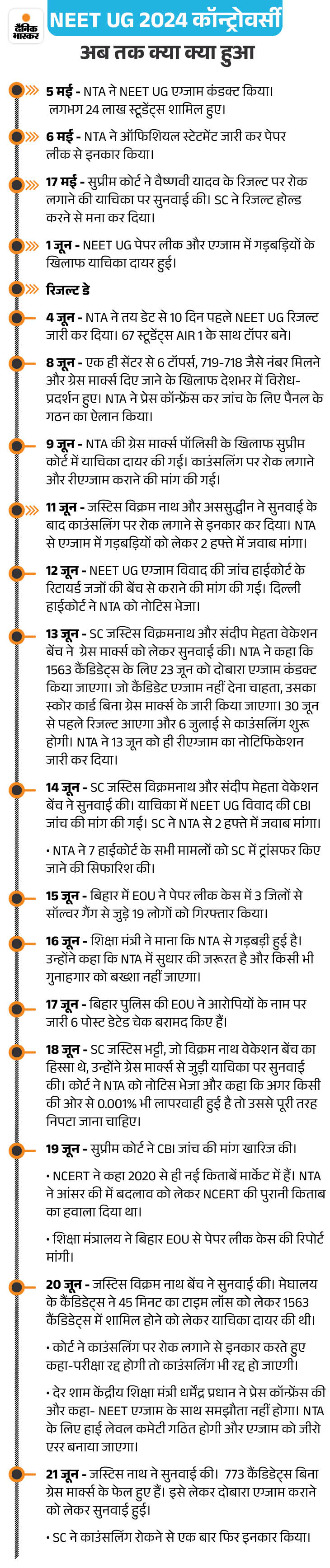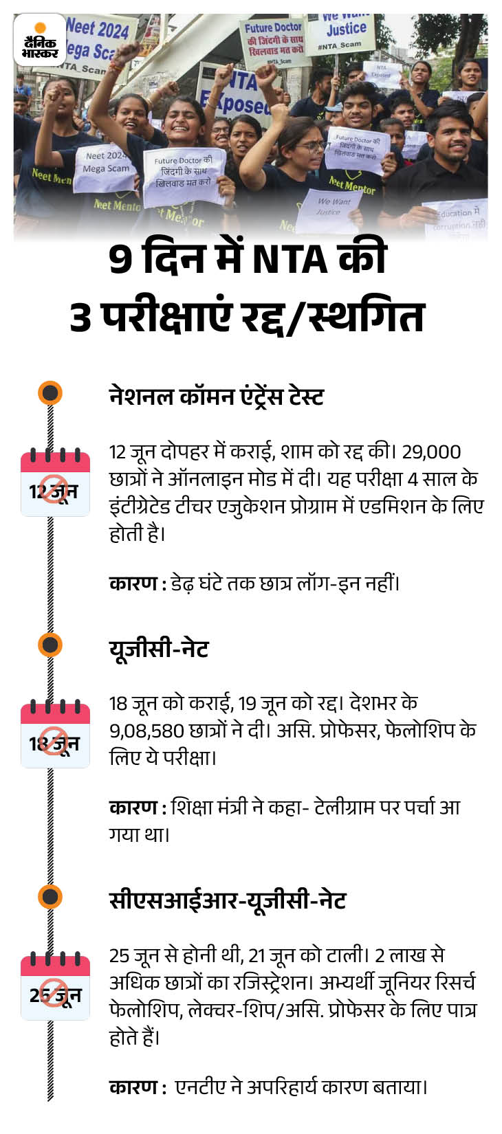 दरअसल, मेडिकल कॉलेजों में दाखिले के लिए होने वाली NEET परीक्षा गड़बड़ी को लेकर विवादों में हैं। केंद्र की नेशनल टेस्टिंग एजेंसी (NTA) ने इस साल 5 मई को यह एग्जाम लिया था। इसमें लगभग 24 लाख स्टूडेंट्स शामिल हुए थे। रिजल्ट 4 जून को आया था।