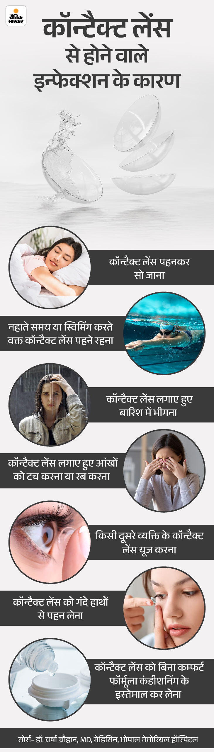 जवाब- कॉन्टैक्ट लेंस से होने वाले इन्फेक्शन के कई कारण हो सकते हैं। खासकर बरसात के मौसम में ये ज्यादा बढ़ जाते हैं क्योंकि ‘एकैंथामियोबा’ (Acanthamoeba) नामक छोटे जीव पानी में रहते हैं, जिसमें नल का पानी, स्विमिंग पूल और हॉट टब शामिल हैं। यदि आप पानी में कॉन्टैक्ट लेंस पहने हुए हैं तो ये आपकी आंखों को आसानी से संक्रमित कर सकते हैं।