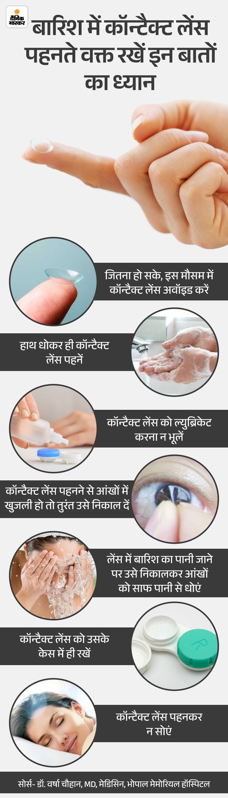 जवाब- मानसून में कई वायरस, बैक्टीरिया और अन्य संक्रमणों के संपर्क में आने का जोखिम किसी भी अन्य मौसम की तुलना में दो गुना ज्यादा होता है। हवा में मौजूद नमी ज्यादा हानिकारक बैक्टीरिया फैलाती है, जिसके चलते कई बीमारियां होती हैं। अगर बारिश में हम कॉन्टैक्ट लेंस यूज करते हैं तो इससे आंखों में इन्फेक्शन होने का खतरा बना रहता है। बारिश का पानी कॉन्टैक्ट लेंस के अंदर चला जाता है और वो रिएक्ट कर सकता है।