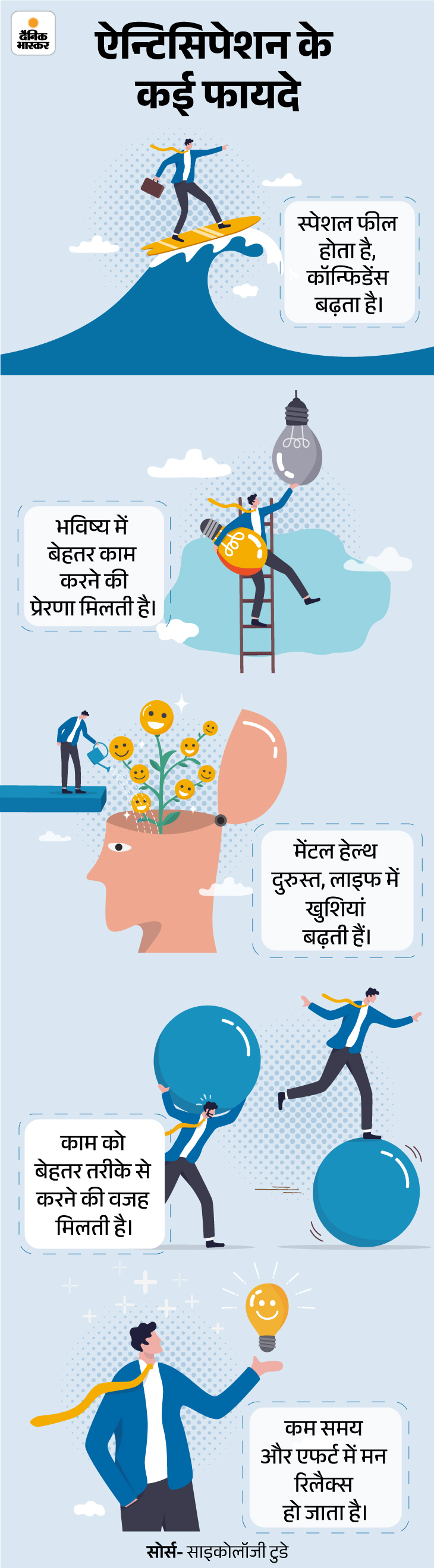 ये बातें किसी प्रीचर टाइप के मोटिवेशनल स्पीकर की नहीं हैं। मनोविज्ञान की साइंटिफिक रिसर्च में भविष्य की सुखद कल्पना यानी ऐन्टिसिपेशन को मौजूदा खुशियों के लिए अहम बताया गया है।