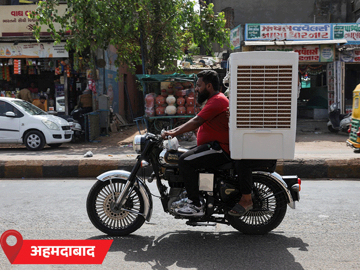 अहमदाबाद में भी गर्मी बरकरार है। एक शख्स बाइक पर कूलर ले जाता हुआ।